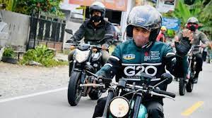 Tampak Menteri Koordinator Bidang Kemaritiman dan Investasi Luhut BinsarPanjaitan, Menteri Pekerjaan Umum dan Perumahan Rakyat Basuki Hadimuljono, serta Menteri Parawisata dan Ekonomi Kreatif Sandiaga Uno turut menaiki sepedamotor masing-masing.