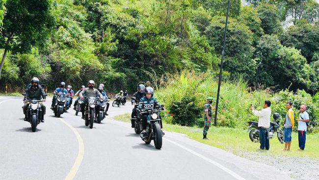 Presiden Joko Widodo mengendarai sepeda motor saat kunjungan kerja ke Provinsi Sumatera Utara pada Rabu, 2 Pebruari 2022. Dari simpang Sibisa, Kabupaten Toba Presiden menunggangi kawasaki W175 ubah suaian (Custom) menuju Kawasan Pantai Bebas Parapat, Kabupaten Simalungun.