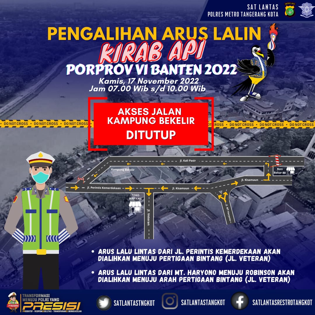 Rakyatbicara.id – Tangerang Kota-Banten, Kantor Berita RBN – Kepolisian Metro Tangerang Kota melakukan pengalihan arus lalulintas (lalin) saat kirab api Porprov Ke-VI Banten 2022 berlangsung Kamis 17 November 2022.