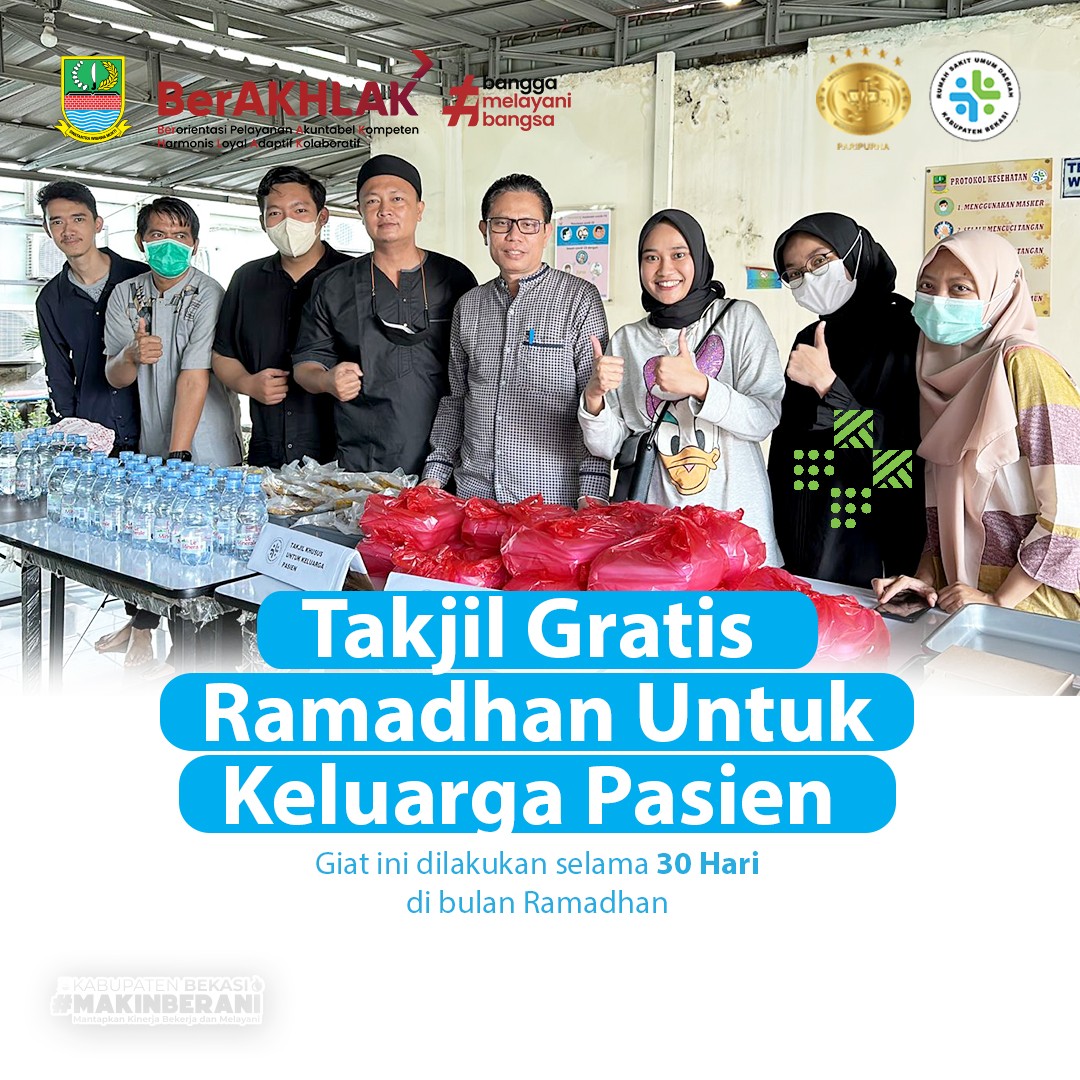 Disampaikannya kegiatan pembagian makanan berbuka puasa atau takjil gratis yang dilakukan oleh RSUD Kabupaten Bekasi dapat ditemui di Lantai Dasar Gedung B, RSUD Kabupaten Bekasi mulai pukul 17.00 WIB. (Arnie/Tim RBN)