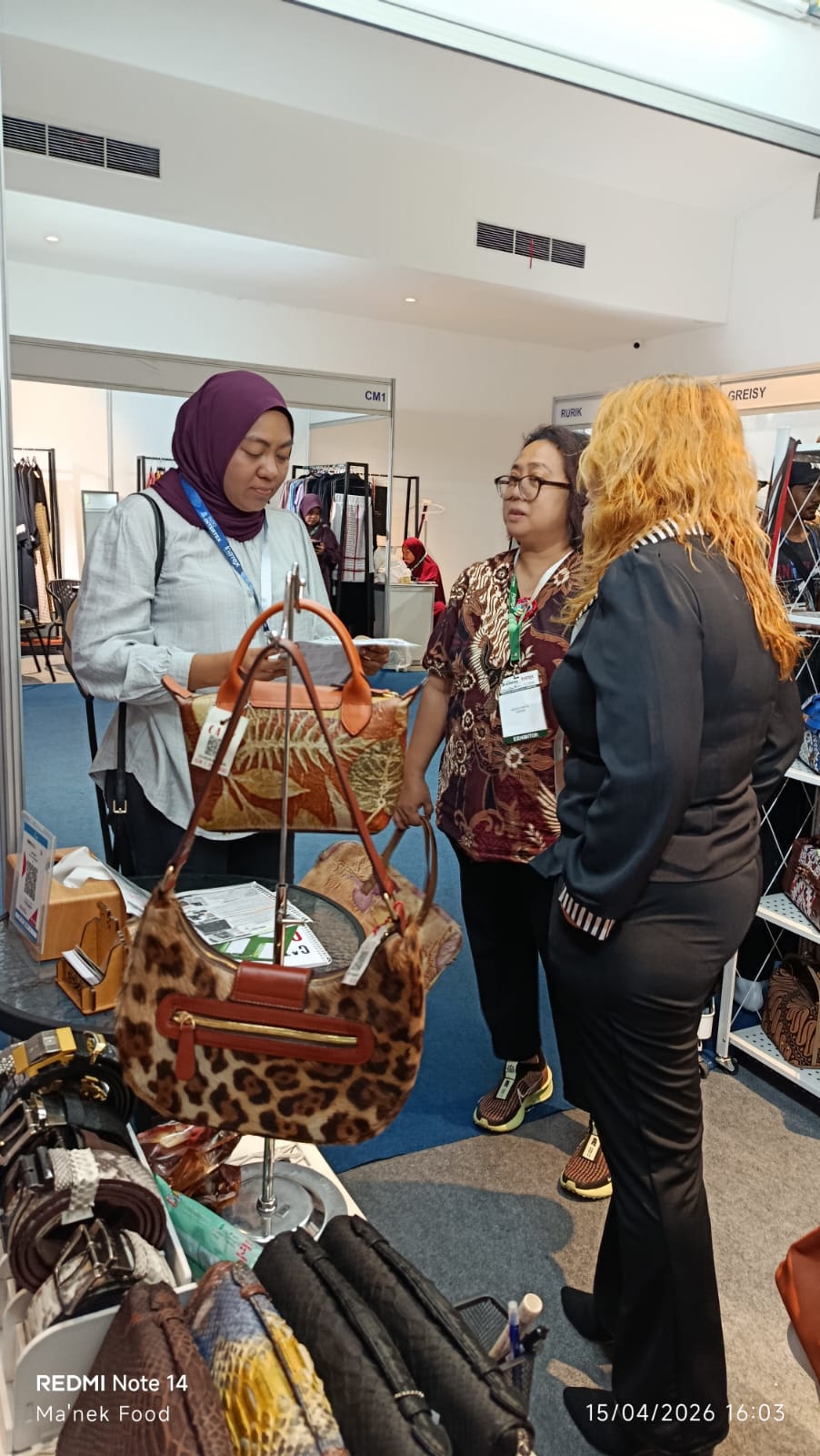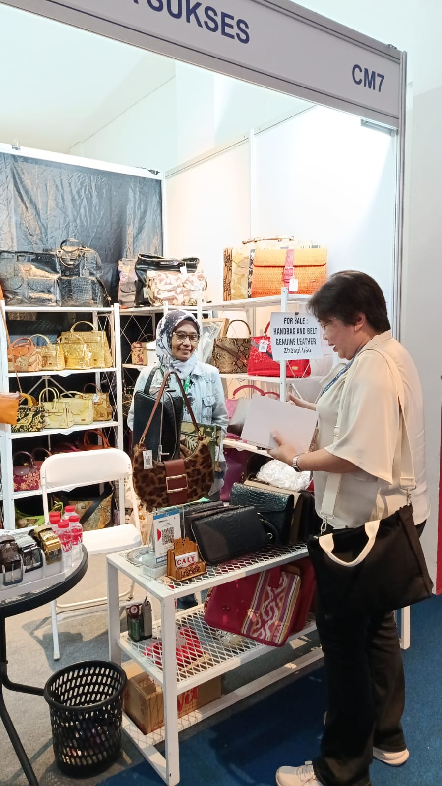 Stand UMKM asal Kabupaten Bekasi ini ramai digemari para buyer dari dalam dan luar negeri. Banyak pembeli dari mancanegara melirik berbagai produk Caly Bags termasuk tas laptop.