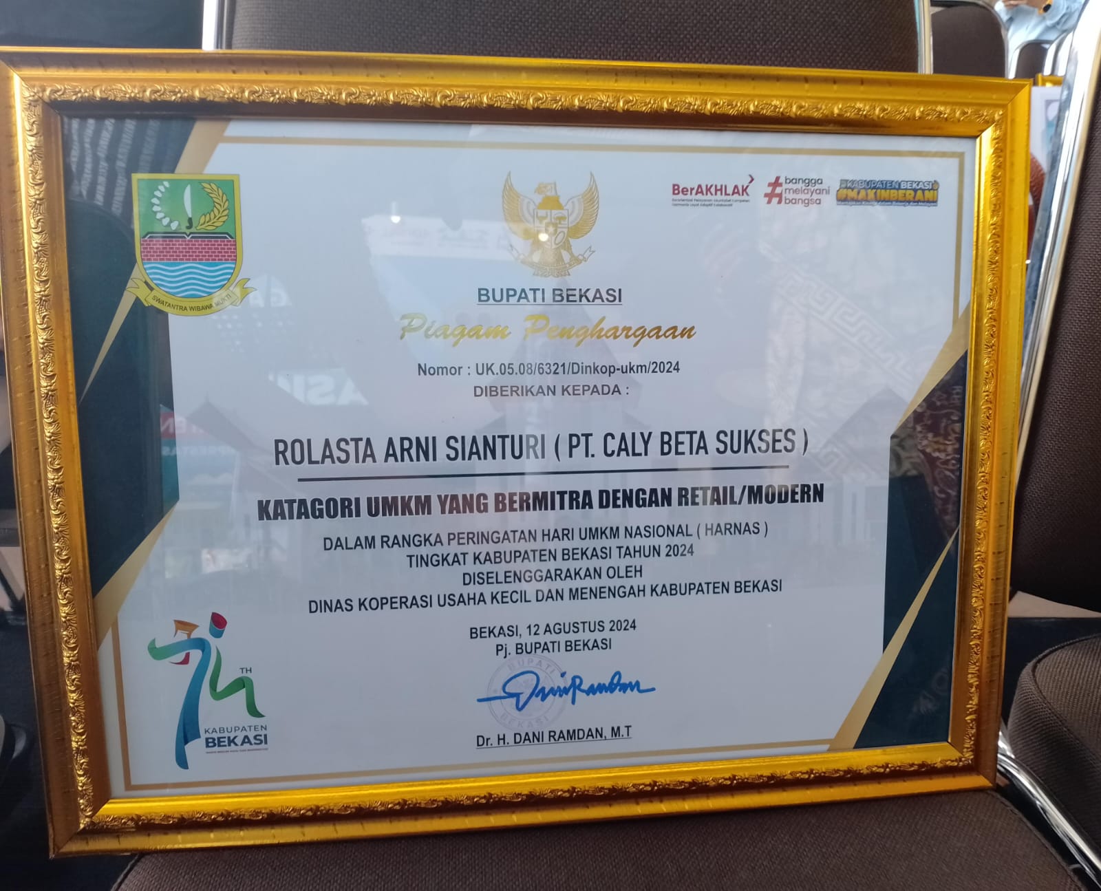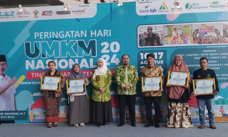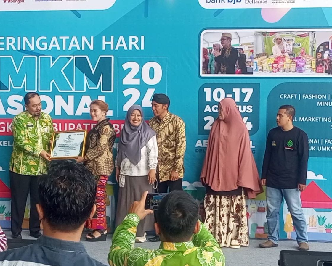 Penghargaan tersebut diberikan oleh Asisten Daerah (Asda) II Kabupaten Bekasi Iwan Ridwan pada saat acara puncak Peringatan Hari UMKM Nasional Tingkat Kabupaten Bekasi Tahun 2024.