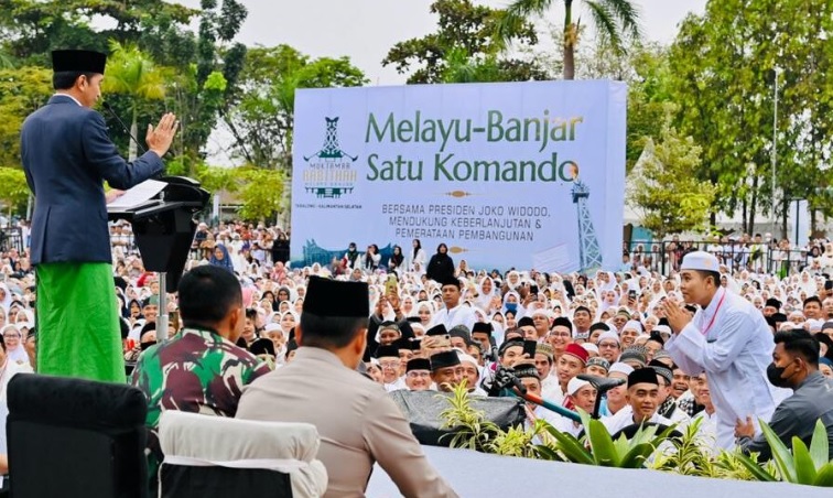 “Juga memohon rida Allah SWT agar selalu membimbing dan memudahkan langkah-langkah kita, dan kepada para alim ulama, tuan-tuan guru, dan para mualim, para kyai, serta segenap masyarakat Melayu-Banjar mohon didoakan bangsa ini,” ucap Presiden. (Arnie/Tim RBN)